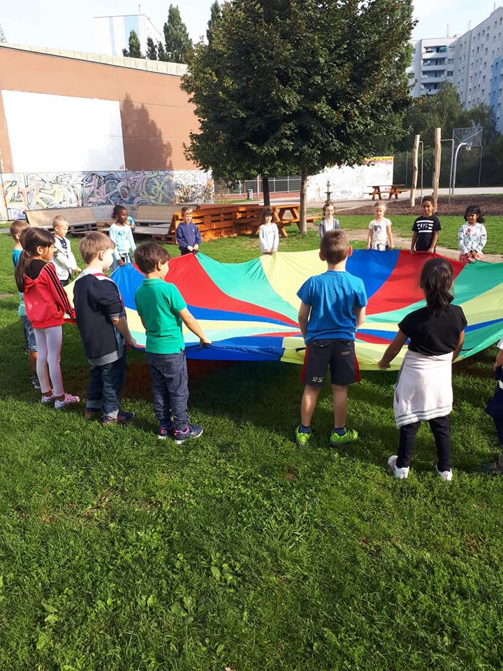 In der ersten Schulwoche hatten die Schülerinnen und Schüler der Dinoklasse viel Spaß mit dem bunten Schwungtuch. Durch verschiedene Spiele lernten die Kinder die Namen ihrer Mitschülerinnen und Mitschüler kennen.
