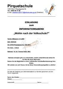 Okt.52025Eltern-Info Elternabend: Wohin nach der Volksschule ?: Montag 5.11.2025 18 Uhr in der Aula im 1. Stock Referent: Hr. Dir.Thomas Fitzko, BEd. Von Schulinfo5. Oktober 2025KommentarnavigationZurückVorheriger Beitrag:Schulfreie Tage 2025/26NächstesNächster Beitrag:Speiseplan KW 45