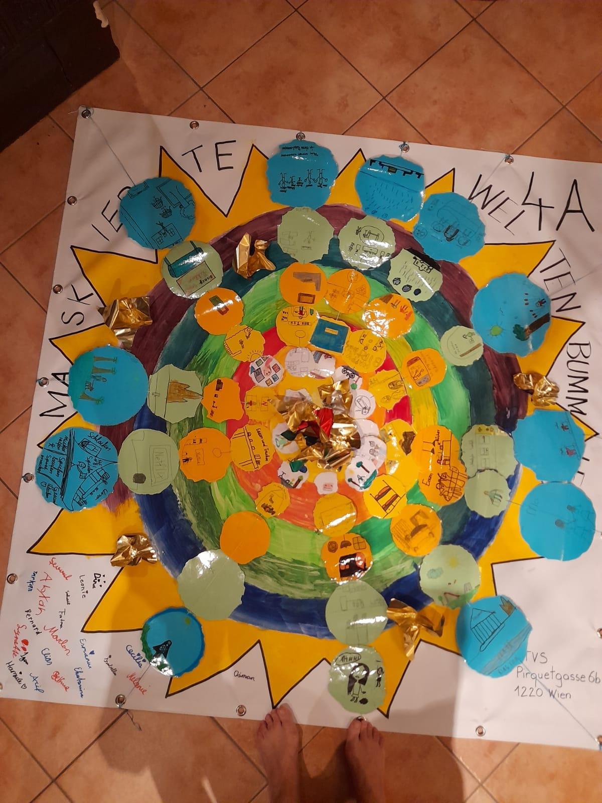 Die goldenen „Blümchen“ haben Sätze oder Wörter im Verborgenen, die unangenehme Gefühle mit den „Maskierten Weltenbummlern“ wegschicken. Da „Bummeln“ langsames Bewegen bedeutet, haben wir die Bilder über den schönen Regenbogen (der zum Muttertag 2020 bei uns im 22.Bezirk eine Stunde lang zu sehen war) gespannt.