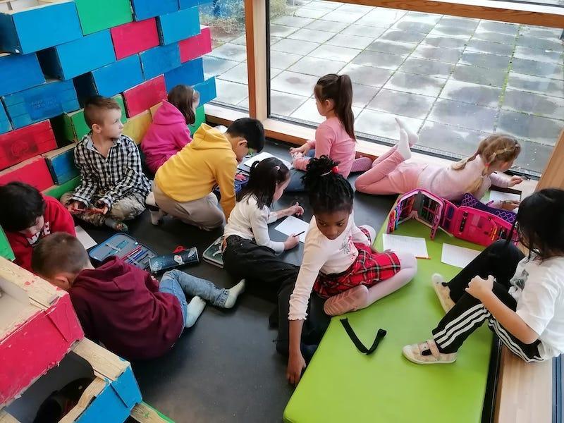 Die Lernzeiten an unserer Schule werden möglichst abwechslungsreich gestaltet. Dabei steht es im Vordergrund, auf die individuellen Bedürfnisse und Lernstände der Schülerinnen und Schüler einzugehen. Hier verbringt die Klasse 1d ihre Lernzeit in einer unserer weitläufigen Begegnungszonen. Es stehen mehrere Aufgabenformen zur Verfügung, z. B. Legen mit verschiedenen Materialien, zu den geometrischen Flächen u. ä., aus denen die Kinder wählen können.